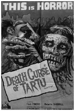 Haría falta un salto de más de medio siglo para llegar a la siguiente muestra de resarcimiento étnico con La venganza de Tartu (Death curse of Tartu, 1966), film de serie B poco atractivo y muy alejado de la genialidad demostrada por Jacques Tourneur en títulos de presupuesto similar como La mujer pantera o Robert Wise en El ladrón de cadáveres. La historia de nuestro film se desarrolla pesadamente mediante actuaciones de actores amateurs en medio de un seductor paraje de fondo, las llamadas everglades, zona pantanosa del sur de Florida y en su momento refugio de muchos indígenas ante la llegada de los colonizadores a mediados del s. XVI. Parece que este fue el punto de partida utilizado por el director William Grefe, ya que el chamán indio antagonista de la producción fue asesinado en ese siglo por invasores españoles. Por consiguiente, Tartu, que así se llamaba el damnificado, juró vengarse de cualquier piel blanca que execrase su tumba y enturbiase su sueño eterno. Cuatrocientos años después, un grupo de jóvenes biólogos llega a la zona para estudiarla, momento aprovechado por el fantasma para desperezarse y acabar con sus enemigos. Pese a la mediocridad general del trabajo, se pueden destacar virtudes, como la creíble atmósfera conseguida o el hecho de constituir un claro antecedente del popular género slasher4, inaugurado por John Carpenter mediante su célebre La noche de Halloween más de dos décadas después (Téllez, 2007, p. 581).