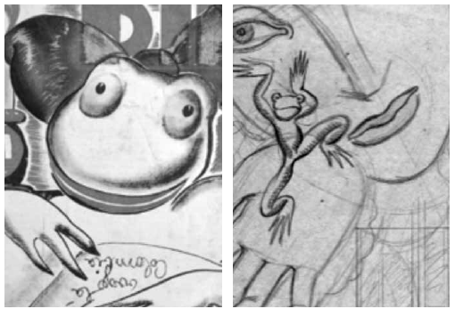 Las cubiertas de Rin Rin muestran la curiosa convergencia (figura 10) entre tradición clásica y modernidad. Los títulos estaban construidos con tipografías racionales, es decir, contrarias al ornamento modernista de línea fluida y sensual; su tipología estaba influida por las corrientes puristas y minimalistas de la escuela Bauhaus y por las funciones pragmáticas y comunicativas promovidas por el constructivismo ruso. La modernidad de la tipografía se caracterizaba por la ausencia de referentes ornamentales superfluos, por la desaparición del aura caligráfica y por la presencia visual de la razón matemática: principio constructor de las letras próximo a las lógicas industriales productoras de formas masivas, rectas, puras y limpias, carentes de manufactura y de afección. Pero las ranas, protagonistas de la revista y siempre presentes en las cubiertas, aluden a la tradición literaria del escritor colombiano de literatura infantil Rafael Pombo, en especial a su famoso cuento El renacuajo paseador, en el que se inspira el nombre de la revista, pues su protagonista es Rin Rin Renacuajo. La tradición clásica es la recuperación de la figuración -la rana-, sumada a recursos de la tradición pictórica -la vela para mostrar al lector nocturno- (figura 10).