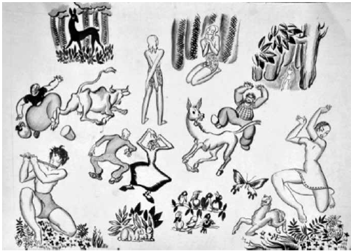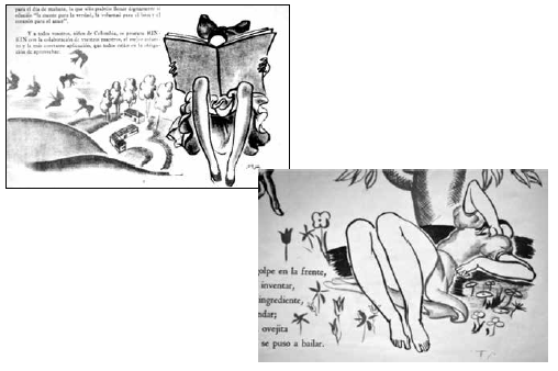 Pero fueron las imágenes de mujeres y niñas de la revista, no los textos, el motivo de ira y reacción del clero rural. Rin Rin visualizó mujeres liberadas del conservadurismo que, a diferencia de las niñas de Chanchito (figuras 1 y 2 vs. figura 6), usaban vestidos cortos que dejaban ver sus cuerpos, en posturas “deseantes”, orgánicas, “indisciplinadas” (figura 7). El clero de la época las consideró “pornografía pura”. Sin embargo hubo contradicciones en Rin Rin. Especialmente en la sección de las “Páginas de Lectura” los textos de esta revista, en correspondencia con las imágenes, indican las actividades de la madre alrededor de los oficios del hogar, preparar la comida o encargarse del vestido, actividades correspondientes con el periodo conservador y su hegemonía social. Puede pensarse que esta contradicción se debió a una serie de textos impuestos para la enseñanza y para las clases de los maestros, correspondientes a los roles de la época, en abierta oposición a los cuerpos libres y orgánicos de mujeres emancipadas entre libros y paisajes, que pudieron ser propuestas carentes de censura elaboradas entre Jorge Zalamea y Sergio Trujillo (figuras 6, 7 y 8).