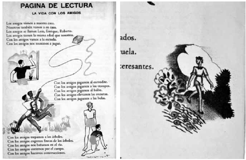 De manera explícita, algunas de las imágenes de los sujetos en Rin Rin se oponían al ideal anacrónico del campesino: obediente, con pensamiento mágico, inmóvil y tradicional. Por el contrario, las imágenes presentaban sujetos (figura 8) en “libertad corporal” -y así mismo mental-, sin miedo, gozosos, expansivos y dinámicos. Imágenes que se resistían al largo periodo de “inseminación” católica de la moral y al ejercicio de los poderes eclesiásticos conseguidos mediante la construcción de los hábitos y las creencias individuales y sociales que determinaban las prácticas del sujeto y su comunidad. Las imágenes de Rin Rin visualizaban todo aquello que por condición histórica no se podía verbalizar explícitamente en los textos educativos: la libertad del cuerpo y el disfrute de la vida -especialmente de las mujeres o niñas- en convivencia con el rigor racional.