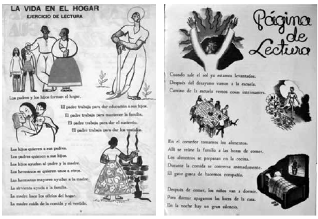 En la cubierta que lleva el texto “Un remiendito” (figura 1), la niña juega a coser -prefigurando a la mujer que trabaja- y el niño, objeto de sus atenciones, se agacha para que ella pueda a su vez inclinarse, “arreglar” sus pantalones y servirlo. Como es evidente, el niño está tan cómodo en su papel que ni siquiera se quita los pantalones para que ella se los arregle; está tan confiado en su docilidad que no muestra temor a un pinchazo, a un súbito arranque de rebelión frente al rol tradicional doméstico de la niña. Ella cumple con el ideal social y de este modo prefigura a la mujer del mañana. Para el Estado conservador, la separación de roles sociales según género era determinante. La educación mixta era mal vista por la Iglesia; se promulgaba permanentemente la separación de niñas y niños en los colegios, y solo se mezclaban cuando el número de ellos era pequeño.
