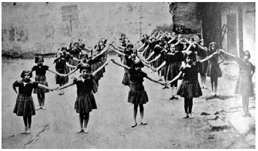 Otra es la posición de Chanchito, donde las niñas se muestran desde la perspectiva del cuidado del cuerpo, un elemento importante que funciona como acontecimiento y que se entronca con el movimiento higienista2. Así, Caro propone una actividad académica al aire libre y también incluye fotografías, como la que muestran a las niñas del Liceo del Comercio en una clase de gimnasia. Esta foto constituye un modelo antagónico al de Rin Rin: niñas disciplinadas, obedientes, de cuerpos ordenados, simétricos, controlados haciendo parte de una estructura colectiva organizada matemáticamente (figura 9).