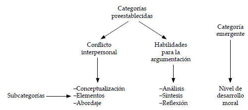 Para determinar la calidad argumentativa de los estudiantes fue preciso analizar la estructura argumental de sus planteamientos; para ello se tomaron como referente tres modelos argumentativos propuestos por Toulmin (2007): los datos (en los cuales se encuentran las razones que usaron), la garantía y la conclusión. Con la estrategia de análisis de dilemas surgió una categoría emergente: los niveles de desarrollo moral. Identificar estos niveles ayudó a comprender y a realizar una interpretación más objetiva a los razonamientos de los estudiantes. Un referente de base al respecto fue la teoría de Lawrence Kohlberg (1992).