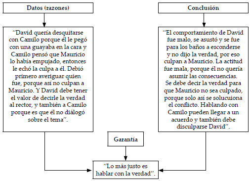 En su estructura argumental se evidenció el uso de razones que respaldan la agresión como forma de solucionar el conflicto. No se reflejó el uso de garantías en la mayoría de los estudiantes; los pocos que trataron de vincularlas lo hicieron de forma descoordinada y sin una transición coherente entre estas y las conclusiones. Esto se corroboró en algunas de sus aserciones: “Opino que estuvo muy mal porque no dialogaron, yo actuaría mal porque me sacan la rabia”; introducen como garantía el diálogo, pero en la conclusión se amparan en un abordaje disruptivo. Esto constató una relación contradictoria entre la primera premisa y la conclusión, mostrándola incongruente y sin fuerza argumentativa: “una conclusión desnuda, desprovista de datos que la apoyen, no es un argumento” (Toulmin, 2007, pp. 143-144).