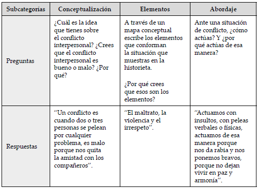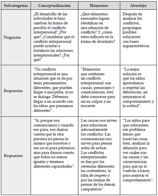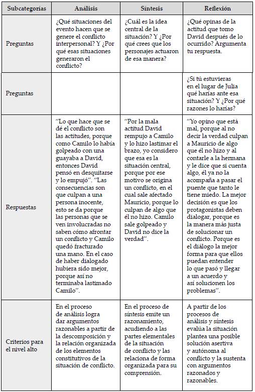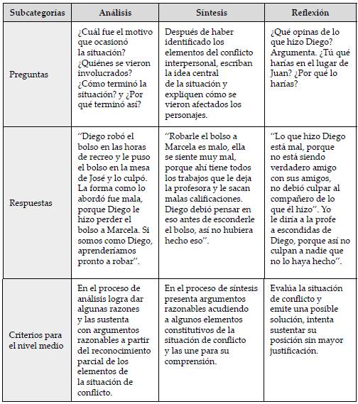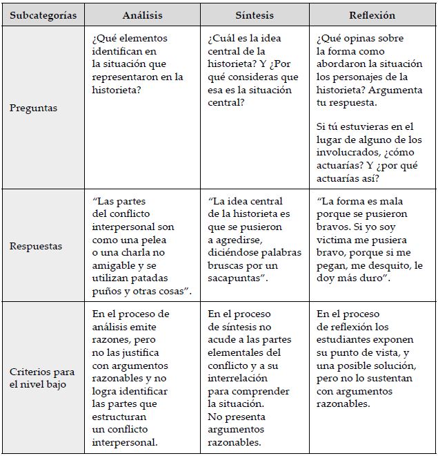 El bajo nivel de análisis, síntesis y reflexión obstaculizó la identificación de los elementos del conflicto interpersonal. Al referirse a las causas, hicieron alusión a las acciones violentas que se exteriorizaron en el conflicto; no consideraron las consecuencias, pues vieron a los involucrados como adversarios que compiten a través de formas disruptivas. Al no evocar los elementos de la situación no lograron sintetizar o reconstruir los hechos para hacer una representación del conflicto. No comprender el conflicto desde sus elementos constitutivos inhibió una postura reflexiva frente a la situación e hizo que plantearan soluciones enfocadas hacia una perspectiva negativa del conflicto.