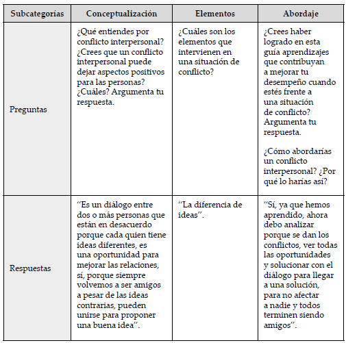 Fase 3. Aplicación de conocimientos sobre el conflicto interpersonal y habilidades para la argumentación (análisis, síntesis y reflexión). Desarrolló una guía: Analicemos situaciones de conflictos interpersonales y propongamos formas constructivas de abordarlo para guiar a los estudiantes hacia la indagación y el análisis de situaciones de conflicto que se presentan en el entorno escolar, y a utilizarlos como recurso para la elaboración de historietas que presenten soluciones razonadas y razonables al conflicto. Estas actividades exigieron la aplicación de conocimientos adquiridos sobre el conflicto interpersonal y la puesta en marcha de habilidades para la argumentación. La información proporcionada en esta fase develó el nivel de progreso alcanzado por los estudiantes con respecto a la comprensión del conflicto interpersonal y la forma de argumentar posibles soluciones.
