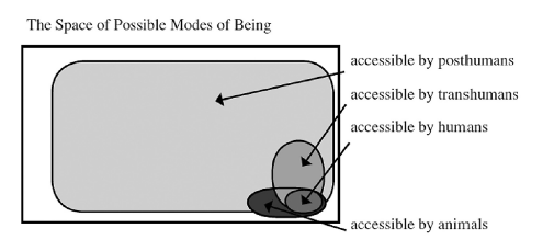 El ser humano es un ser que se caracteriza por su limitación natural, pues existen una serie de pensamientos, sentimientos, experiencias, etc., a las que tendríamos la posibilidad de acceder si superáramos las limitaciones que nos impone nuestra naturaleza biológica. Es asombroso pensar que existe un universo de posibilidades más allá de lo que conocemos. Ese universo de posibilidades es posible disfrutarlo por medio de una nueva realidad poshumana, que trascienda lo transhumano. Aquí, Bostrom establece una clara diferenciación entre lo transhumano y lo poshumano, considerando al primero como un momento de transición caracterizado por mejoras moderadas; en cambio, el poshumano va más allá del estado de transición y se sitúa en una nueva esfera. En lo que concierte a la accesibilidad de la realidad posible, Bostrom utiliza la siguiente figura para ilustrar gráficamente las parcelas de dominio de los animales, los humanos, los transhumanos y los poshumanos (Bostrom, 2005, p. 5).