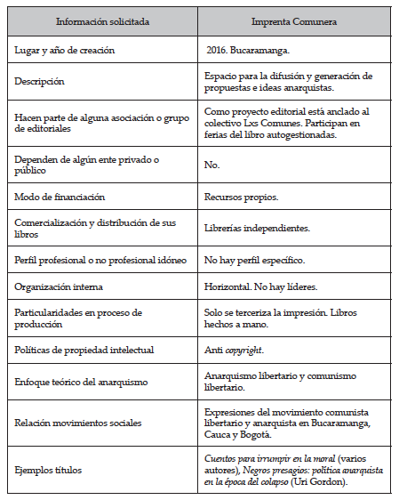 A continuación, haremos la caracterización de las tres editoriales que aquí nos ocupan. Metodológicamente, estas editoriales fueron elegidas porque son tres de las cuatro identificadas dentro de la “ola anarquista” de edición colombiana, según corrobora un artículo escrito por Andrés J. López (2017) en la revista de divulgación Cartel Urbano (faltó la editorial El Aguijón, cuyos datos no se incluyen por falta de respuesta a la entrevista). Estas editoriales fueron escogidas por compartir la misma línea editorial, el anarquismo, enfoque que permite entrever una relación entre edición, movimientos sociales y activismo que resulta atípico en el ámbito de la edición tradicional. La información que se presentará a continuación en las tablas 1, 2 y 3 está basada en la página web de las editoriales, y en las respuestas dadas a una entrevista semiestructurada que se hizo a cada editor, cuyo enfoque eran los aspectos de gestión.