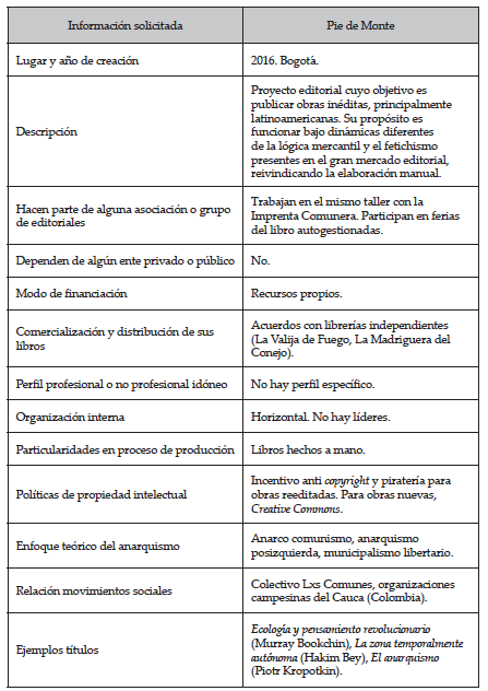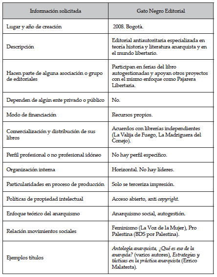 Abstract: This article is a theoretical reflection on the category of editorial independence, starting from the analysis of three Colombian anarchist publishers (Pie de Monte Editorial, Imprenta Comunera and Gato Negro) and their role within a context in which market concentration in large transnational conglomerates prevails. The main objective is to see how, given that the notion of "independence" is constantly changing and encompasses heterogeneous projects, theoretical tools such as the concept of cultural formations by Raymond Williams, and, in this particular case, the alternative and radical media of John Downing and Chris Atton, are accurate to move from a simplistic and static view of the editorial field (independent-commercial) to analyzing the practices of specific projects beyond these categories, as these concepts allow studying cultural practices from their dynamism and interconnection with others social processes. As from this analytical approach, we concluded that these anarchist projects offer alternatives to the neoliberal capitalist dynamics of the dominant publishing houses, based on a self-management model that points towards an editorial task related to the idea of the commons.