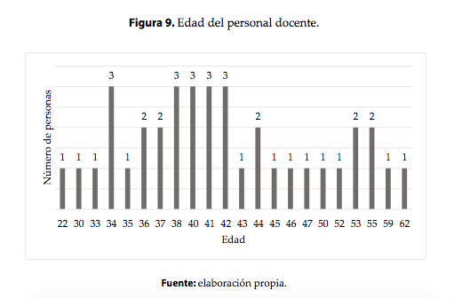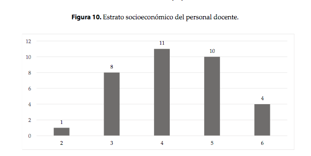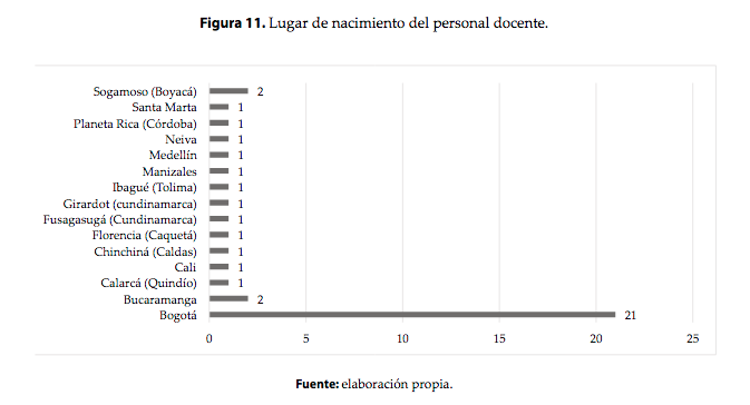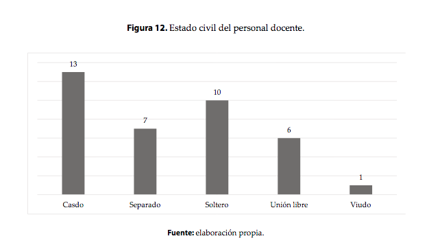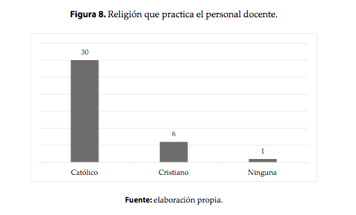 Respecto al personal docente, de las 37 personas encuestadas, el 54 % reportó tener especialización, el 40.5 %, maestría, y el 5.4 %, doctorado (véase Figura 7). Por otra parte, el 89 % (33 participantes) dijo ser de sexo femenino, mientras que el 11 % (4 participantes) reportó ser de sexo masculino; respecto a la religión que practica, el 81 % reportó ser católico, el 16.2 %, cristiano, y el 2.7 % dijo no practicar ninguna religión (véase Figura 8); y el 100 % de la muestra reportó ser heterosexual. Adicional a esto, el promedio de edad de este grupo fue de 42 años (véase Figura 9); y el 32.4 % era de estrato socioeconómico cuatro, el 29.7 % de estrato cinco, el 24.3 % de estrato tres, el 10.8 % de estrato seis y el 2.7 % de estrato dos (véase Figura 10). Además, el 56.7 % era procedente de la ciudad de Bogotá (véase Figura 11), el 100 % había vivido en la ciudad de Bogotá durante los últimos cinco años; y el 35.1 % era casado, el 27 %, soltero, el 18.9 %, separado, el 16.2 %, en unión libre, y solo un participante (el 2.7 %) reportó que era viudo (véase Figura 12).