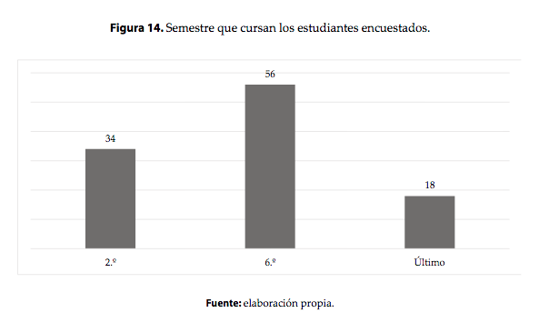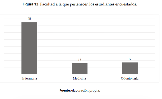 Por último, de los 108 estudiantes encuestados, el 69.4 % pertenecía a la Facultad de Enfermería —75 estudiantes—, el 14.8 %, a la Facultad de Medicina —16 estudiantes, incluidos los que pertenecía a los programas de Optometría e Instrumentación quirúrgica—, y el 15.7 %, a la Facultad de Odontología —17 estudiantes— (véase Figura 13). En cuanto al semestre que cursaban los estu- diantes, el 31.4 % dijo ser de segundo semestre, el 51.8 %, de sexto semestre, y el 16.6 %, de último semestre (véase Figura 14). Además, el 25 % afirmó ser de sexo masculino, mientras que el 75 % dijo que era de sexo femenino.