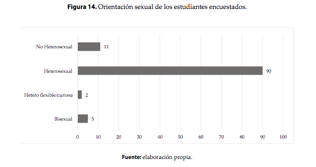 También, cabe señalar que, en términos generales, se observa una predilección frente a las representaciones sociales con respecto a temas de percepciones, respeto, cultura, religión, desempeño académico, conocimientos, normatividad y aspectos éticos; pues se reconocieron, mediante las encuestas, personas perte- necientes a la comunidad lgbt, y todas ellas dentro de la población estudiantil, con un porcentaje global del 10.7 % —mucho mayor que lo reportado en la encuesta nacional de demografía y salud: 2.8 % (Rubio, 2017)—.