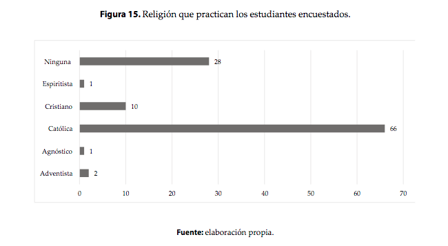 Adicional a esto, respecto a su orientación sexual, el 83.3 % dijo ser heterosexual, el 10.1 %, no heterosexual, el 4.6 %, bisexual, y el 1.9 %, heteroflexible-curiosa (véase Figura 14); y, respecto a sus prácticas religiosas, el 61.1 % afirmó que practicaba el catolicismo, el 25.9 % dijo no practicar ninguna religión, el 9.2 % respondió que era cristiana, el 1.9 % dijo ser adventista, y el 0.2 % afirmó que era espiritista (véase Figura 15).
