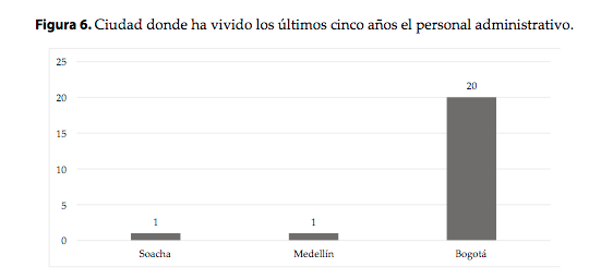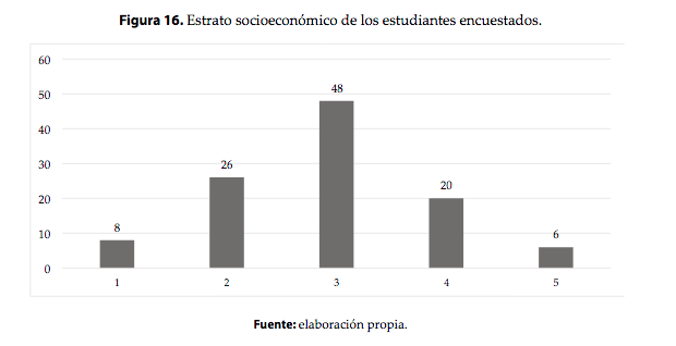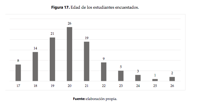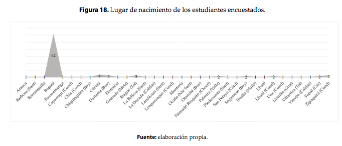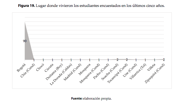 También, es importante mencionar que el 44.4 % era de estrato tres, mientras que el 24 % era estrato dos, el 18.5 %, de estrato cuatro, el 7.4 % de estrato uno, y el 5.5 %, de estrato cinco (véase Figura 16); que el promedio de edad de los estudiantes era de 20 años (véase Figura 17); que la ciudad de origen más frecuente de los estudiantes era la ciudad de Bogotá, con un 28.7 % (véase Figura 18); que durante los últimos cinco años los estudiantes vivieron principalmente en Bogotá, con un 83.3 % (véase Figura 19); y que el 93.5 % (101 estudiantes) eran solteros, mientras que el 3.7 % reportó estar en unión libre (4 estudiantes), el 0.92 % (1 estudiante) dijo ser separado, y el 0.92 % (1 estudiante), estar en una relación abierta.