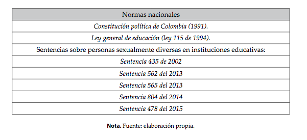 De igual forma, en Colombia, aunque se ha avanzado en materia jurídica para la inclusión de estudiantes sexualmente diversos, estas políticas no han trascendido de la formulación, y queda un largo camino hacia su implementación (Ramírez, 2017), factor necesario y determinante en la eliminación de las barreras que existen para la población lgbt en el acceso a su derecho a la educación. En la Tabla 1 se resume la normatividad jurídica y legal en materia de inclusión.