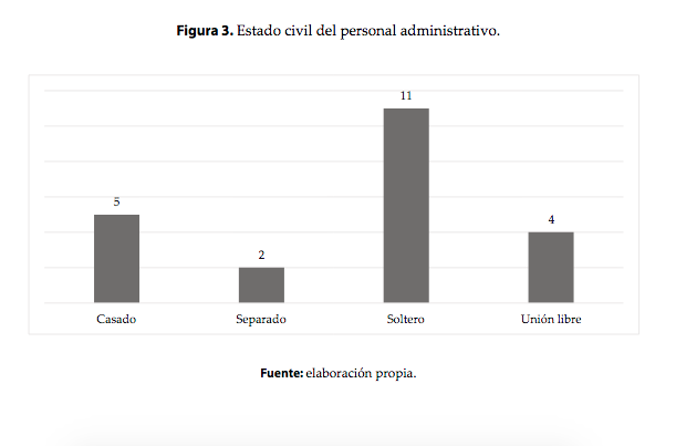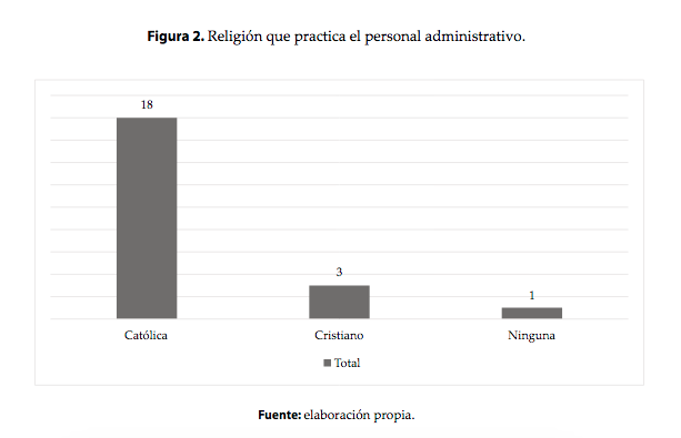 De las 22 personas encuestadas, el 63.6 % tenía un nivel educativo técnico, el 13.6 % tenía tecnólogo terminado, el 18.1 % eran profesionales, y solo el 4.5 % (un administrativo) tenía como nivel máximo de educación el bachillerato completo (véase Figura 1). Por otra parte, el 100 % de las participantes fueron mujeres heterosexuales; respecto a la religión que practicaban, el 81.8 % era de religión católica, el 13.6 % era cristiana, y el 4.5 % no practicaba ninguna reli- gión (véase Figura 2). También, el 63 % de la muestra (14 participantes), era de estrato socioeconómico nivel tres, mientras que el 36.3 % (8 participantes), era de estrato dos; y el 50 % eran solteras, mientras que el 22.7 % eran casadas, el 18.1 % reportó estar en unión libre, y el 9.1 % eran separadas (véase Figura 3). Finalmente, el promedio de edad de las participantes fue de 37.5 años (véase Figura 4); el 77.2 % nació en Bogotá, Colombia (véase Figura 5), y el 90.9 % había vivido en la misma ciudad durante los últimos cinco años (véase Figura 6).