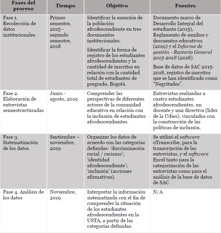 En este sentido, se recogieron tres tipos de datos diferentes para comprender la situación de los estudiantes afrodescendientes en la USTA Bogotá. Inicialmente se acudió a la revisión de tres documentos institucionales para conocer: a) cómo la Universidad actúa respecto a la inclusión de estudiantes afrodescendientes; b) si existen algunas decisiones institucionales, y c) en qué oportunidades se menciona a esta comunidad dentro de dichos textos. En segunda instancia, se recurre a la base de datos del sistema académico SAC, con el fin de tener un panorama general respecto a la cantidad de estudiantes afrodescendientes matriculados en relación con el total de estudiantes. Por último, para poder ampliar la comprensión a partir de los testimonios de diferentes personas relacionadas con el proceso de inclusión de estudiantes afrodescendientes, se realizan seis entrevistas: cuatro estudiantes afrodescendientes cuya selección estuvo basada en un muestreo por conveniencia, dada la imposibilidad de conocer el listado de estudiantes identificado como “negritudes”, y la cercanía y disponibilidad de los estudiantes con una de las autoras del presente estudio, también afrodescendiente; un docente no afrodescendiente, y un administrativo no afrodescendiente , quienes fueron seleccionados por su relevancia y trayectoria en la Universidad en los procesos de inclusión y su participación directa en la construcción de las políticas de inclusión de la Universidad.