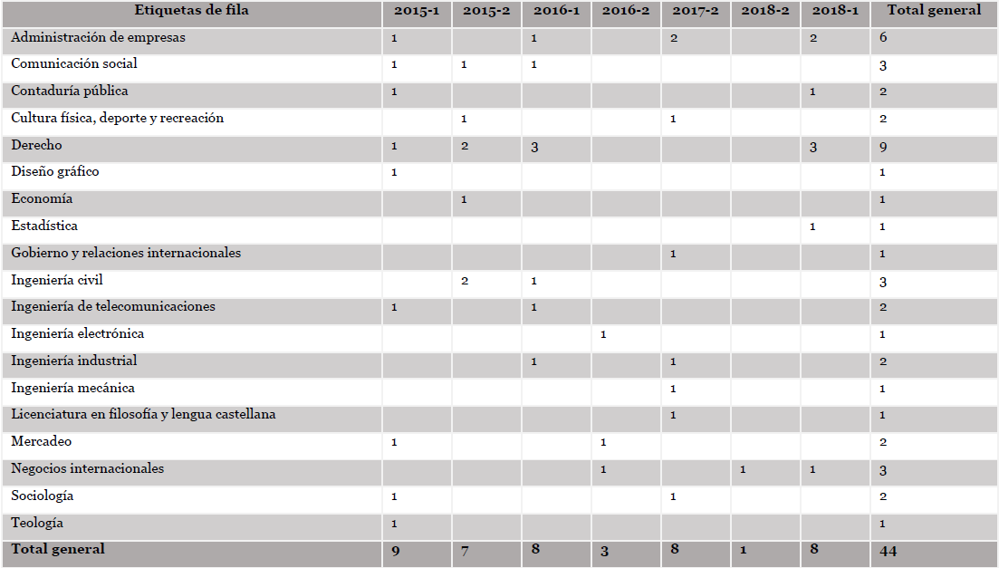 Respecto al registro de estudiantes afrodescendientes, de acuerdo con la información suministrada por el Sistema Académico SAC, entre los años de 2015 y 2018, 44 estudiantes de 82728 fueron registrados en el sistema con caracterización “Negritudes” en ante la USTA, es decir un 0,053 %. En la tabla 2 se presenta la relación por semestre y programa académico: