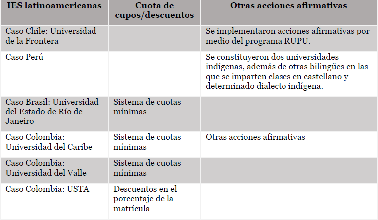 Ahora bien, al hablar de inclusión para comunidades afrodescendientes en la USTA Bogotá, se identifica la incorporación de acciones afirmativas en el caso de los descuentos de matrícula. En los hallazgos de las seis IES latinoamericanas revisadas, se encuentra que tres de ellas se acogen como única forma de acción afirmativa al sistema de cuotas mínimas y las otras tres implementaron diversas formas y manifestaciones de acciones afirmativas en sus instituciones. Lo anterior se plantea en la tabla 3.