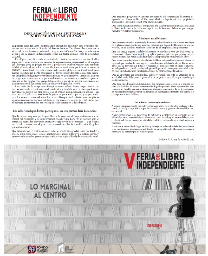 Respecto a la Feria del Libro Independiente, esta fue realizada por 7 años consecutivos con apoyo del Fondo de Cultura Económica (FCE), que disponía la Librería Rosario Castellanos en Ciudad de México para el evento. El anterior manifiesto subraya la importancia de la relación con instituciones públicas, aunque algunos cambios internos en el FCE llevaron a que la feria no se celebrara de 2017 a 2019. Es significativo el hecho de que la feria se celebre o no dependiendo de la disposición del FCE y sus espacios, porque entrevé la problemática de ese ser “independiente”: implica, en ciertos aspectos, depender, incluso más que otras editoriales con un capital económico robusto, de agentes externos como, en este caso, de una editorial apoyada por el Estado mexicano.