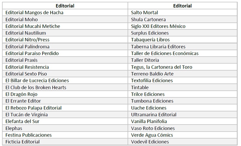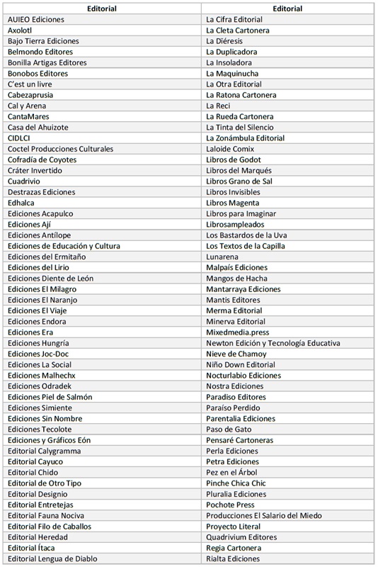 Para terminar este panorama de la EI mexicana, vale la pena presentar un consolidado de las editoriales que se ubican allí, identificadas como tal por alguna de las siguientes razones: hacen parte de la AEMI, pertenecen a la LEI, han participado en la Feria del Libro Independiente, han participado en otros eventos celebrados bajo la consiga de la independencia, o se autodenominan de este modo en las descripciones de sus sitios web. Este listado (tabla 1), elaborado a partir de registros de editoriales recogidos entre 2018 y 2022, no pretende establecer la totalidad de los proyectos de EI en México, sino dar una idea de la multiplicidad de editoriales que se identifican con este concepto de “independencia”, aunque sean de distinta naturaleza en sus contenidos y prácticas, y aunque, incluso, piensen dicha categoría de un modo distinto, como se verá en la siguiente sección.