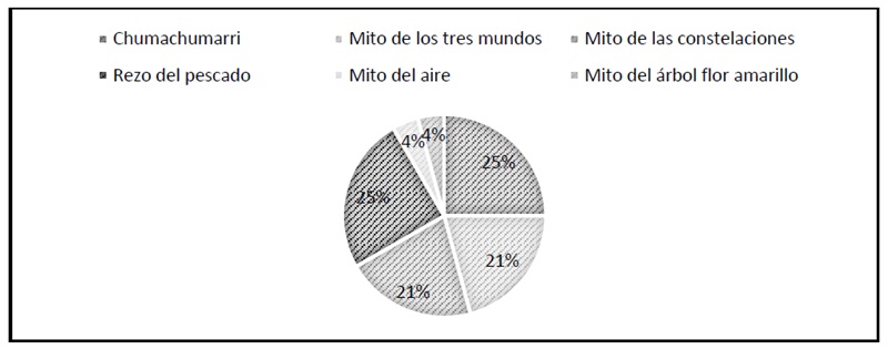 En relación con la segunda pregunta, todos manifestaron conocer el mito del Chumachumarri y El rezo del pescado. Solo dos personas manifestaron conocer el mito de Los Tres Mundos, el mito del Aire y el mito del Flor Amarillo. En cuanto a qué percepción tienen de un dios, señalaron que es un ser supremo que no se puede definir; es todo; es un creador del mundo y de todas las cosas; un semejante que no se ve, pero que se siente, y que en todo momento está presente; finalmente, consideran que es una creencia sagrada en la personificación de una deidad de carácter espiritual.