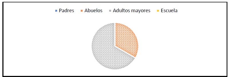 Al indagar sobre quién recae la labor de difundir el conocimiento relacionado con los mitos y las leyendas en la comunidad, queda claro que esta ha sido una labor asumida por los adultos mayores, sabedores de la comunidad y los abuelos; sin que la escuela ni los padres de familia se hayan interesado en el tema, tal como se logra observar en la figura 3.
