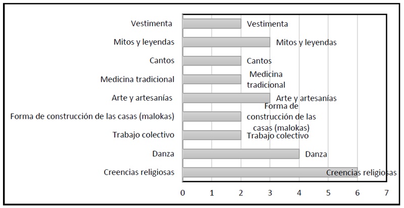 En cuanto a las tradiciones y costumbres propias de la comunidad Achagua, el testimonio de los seis sabedores evidencia que, a través del tiempo, estas también se han ido perdiendo. Los seis coinciden en que las creencias religiosas ancestrales prácticamente han desaparecido, les siguen la danza, las expresiones artísticas, la medicina tradicional, las formas de construir y el trabajo colectivo, como se muestra en la figura 4.