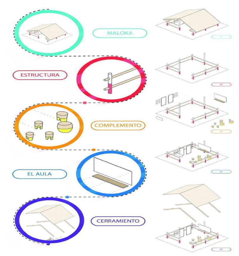 Seguido a esto se presenta la propuesta de aula de difusión, que sería acondicionada con los materiales y objetos que ellos manifiestan ser representativos de su cultura. Esta propuesta fue aprobada con especial interés; los participantes propusieron la utilización de los colores con significado para la comunidad, entre ellos, el amarillo y el café, que representa el color de la madre tierra; el blanco, la pureza; el rojo, la sangre de los guerreros achaguas; el verde, el color de la madre naturaleza (véase figura 7).