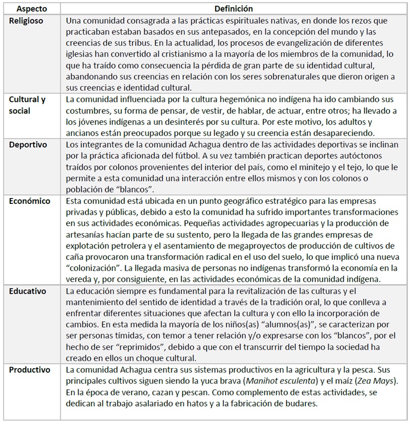 En la comunidad indígena Achagua se hace necesario salvaguardar su identidad cultural (mitos y leyendas), su cosmogonía y cosmovisión, así como preservar su lengua materna, sus tradiciones, costumbres y hábitos, entre otros (Galindo et ál., 2005) para conservar el legado como etnia destacada en la altillanura colombiana. Dicho compromiso permite incentivar en la comunidad el respeto y amor hacia su propia cultura, que se ha visto intervenida por factores que han modificado algunas de sus creencias y la manera como son transmitidas de generación en generación. Tal es el caso de la tradición oral, la narración de historias ha pasado a un segundo plano, acarreando en la comunidad la pérdida gradual de su cultura y cosmogonía (Galindo et ál., 2005).