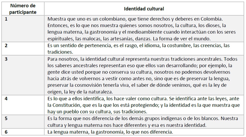 Como se puede apreciar en la figura 2, los dioses conocidos en común por las personas entrevistadas son: el dios Chumachumarri y el dios Kuwei, el dios Donunun (conocido por dos entrevistados), el dios Aguacaminare (conocido por dos entrevistados) y el dios Monuneta (conocido solamente por uno de los participantes). Sobre la manera en que ellos definen la identidad cultural, se obtuvo la siguiente información consolidada en la tabla 3.