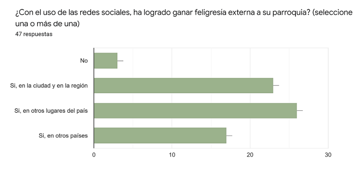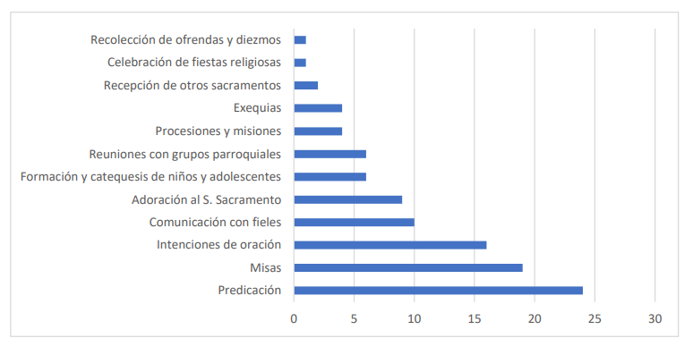 Contrario a lo que podría esperarse, las misas, lejos de disminuir, aumentaron. Algunos duplicaron las misas diarias y dominicales y las audiencias crecieron. Los miembros de los sitios parroquiales en redes como Facebook y YouTube crecieron vertiginosamente, y a juzgar por los comentarios, había buena participación. Algunas parroquias tradicionales, como San Laureano de Bucaramanga, transmitieron no solo por redes, sino también por TV y radio FM (Parroquia San Laureano, 2021). Así es que, para los sacerdotes encuestados, la celebración de la misa no fue la actividad más afectada por la pandemia y, al contrario, fue una de las más beneficiadas, al igual que lo fue su labor de predicación, todo gracias a las redes sociales. Junto con las misas, las intenciones de oración, ligadas a ellas, crecieron y esto también fue reportado por los encuestados. Curiosamente, la adoración del sacramento eucarístico también fue beneficiada por la pandemia; esto debido que a muchos sacerdotes ingeniaron momentos de adoración virtual, donde se exponía la custodia con la hostia consagrada ante la cámara, al tiempo que un agente de pastoral guiaba la oración, o simplemente en un ambiente de silencio.