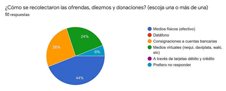 Con el cierre de templos, era imposible usar alguna de las anteriores prácticas, y pocas parroquias tenían implementados sistemas de recaudo bancario o digital de recursos. Así que se tuvo que aprender e ingeniar rápidamente, implementando sistemas digitales, a través de transferencias de fondos de banco a banco9 y sobre todo por medio de aplicaciones bancarias de giro rápido de fondos de celular a celular10. Esto significó el inevitable aumento de la formalización bancaria, algo que luego los banqueros destacaron como un suceso positivo que propició la pandemia (González, 2020). Falta ver si dicha formalización se mantuvo, puesto que, evidentemente, esto significa mayor control y supervisión de los ingresos parroquiales, algo que la captación en efectivo reduce de sobremanera. En todo caso, la encuesta muestra que los párrocos no se volcaron por completo hacia las nuevas tecnologías y siguió manteniéndose el recaudo de fondos en efectivo.