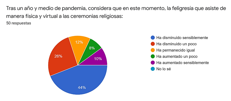 El 70 % de los párrocos consideró que su feligresía había disminuido mucho o un poco un año y medio después del inicio de la pandemia, cuando los templos ya llevaban un año de haber sido reabiertos. Esto ocasionó las quejas de varios clérigos, quienes reprochaban a los fieles por no ir a misa, pero en cambio no tenían reparo en “atiborrar los centros comerciales”, arriesgando contagiarse.