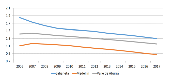 Para el año 2003 se construye el primer edificio, generando ruptura en el proceso de construcción sociohistórico, pasando de tener 54 595 habitantes en 2009 a tener 103 217 en 2018, reflejando crecimientos exponenciales en los últimos años (Alcaldía de Sabaneta, 2018), es decir, se creció en un 89 % en cuestión de 9 años. Incluso, es un municipio con tasas de crecimiento poblacional superiores a las de Medellín y el Valle de Aburrá entre 2006 a 2017 (figura 2).