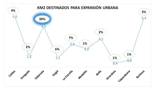 La explosión demográfica estuvo expresada en que el PBOT destinará 4.5 km² de su territorio, para la expansión urbana, es decir, el 33.3 %, mientras que los demás municipios destinarán un porcentaje menor, como se ilustra en la figura 3.