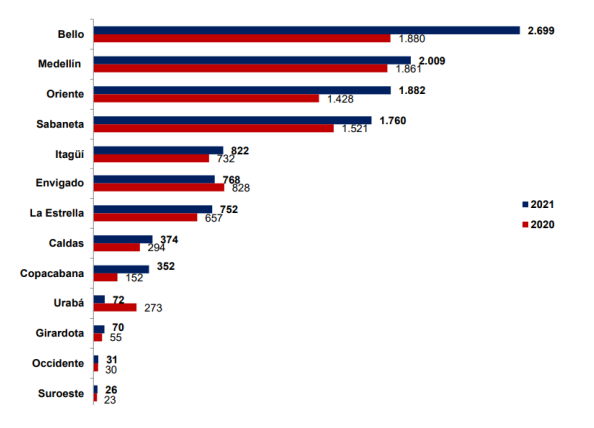En este sentido, la gentrificación y el mercado inmobiliario tienen una relación estrecha entre sí; cifras presentadas por el DANE (2020) de las licencias de construcción entregadas en 2019 develan una desaceleración de este mercado; sin embargo, venía de un crecimiento sostenido en la última década. En Colombia, la cantidad de metros cuadrados licenciados se redujo en 3.7 %, mientras que en el Valle de Aburrá la contracción llegó hasta el 7.5 %. Sobresale que los mayores licenciamientos se llevaron a cabo en Bello con 707 000 m², seguido por Medellín con 545 000 m² y Sabaneta con 239 000 m², consistentes con las ventas de vivienda nueva que se registran actualmente. En la figura 4, se representa la dinámica inmobiliaria de Antioquia para los años 2020-2021; se observa que Bello (23 %), Medellín (17 %), Oriente (16 %) y Sabaneta (15 %) ocupan los primeros cuatro lugares, manteniendo crecimientos constantes cada año (Camacol Antioquia, 2021).