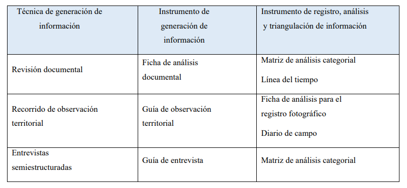 Para la generación y recolección de información se usó la revisión documental, recorrido territorial, y la entrevista. También fue necesario realizar una inmersión en el territorio, conociendo no solo las perspectivas académicas e institucionales, sino dándole valor a las vivencias de los actores de Sabaneta (tabla 1).