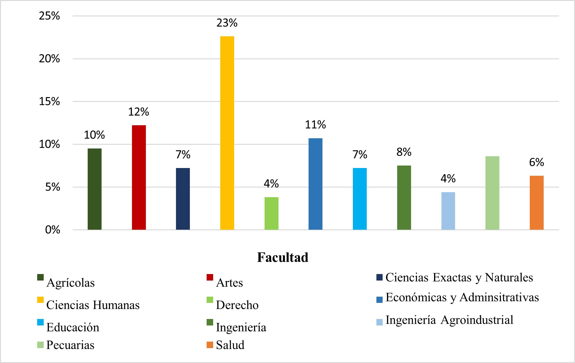 Lo anterior permite observar que el mayor porcentaje de representación se encuentra en la Facultad de Ciencias Humanas con un 23 %, seguido de la Facultad de Artes con un 12 %, mientras que las facultades de Derecho e Ingeniería obtuvieron la menor representación con un 4 %; datos consistentes con el número de estudiantes que conforman cada facultad.