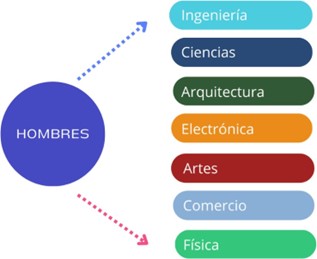 Como se evidencia en la figura 2, la palabra “hombres” se encuentra asociada a profesiones como ingeniería, ciencias, electrónica, arquitectura, artes, comercio y física, principalmente.
