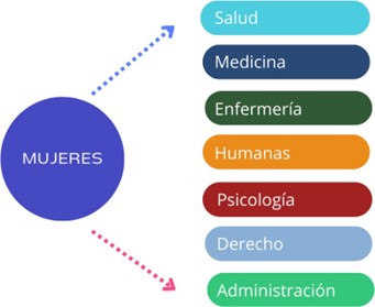 De igual manera, en la figura 3 se asocia la palabra “mujeres” con carreras de salud, entre ellas, medicina y enfermería; se resaltan las carreras relacionadas con humanidades, como psicología, y menor medida derecho y administración.