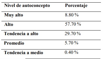 La tabla 1 muestra los resultados generales de la prueba de Autoconcepto AF5.