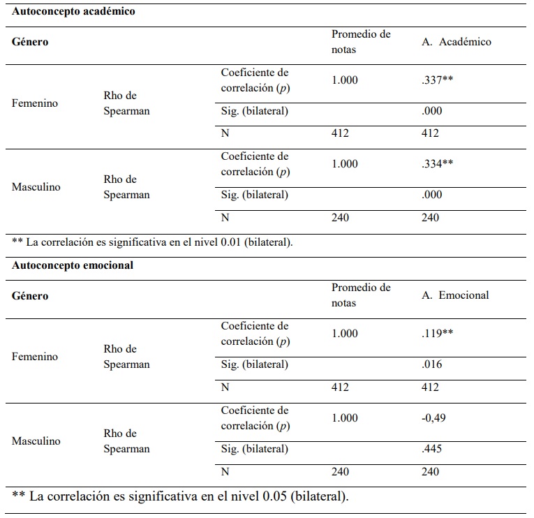 Dados los resultados de las pruebas de normalidad, para determinar las correlaciones entre las variables se aplicó el coeficiente de correlación de Spearman para muestras no paramétricas en las dimensiones de autoconcepto (académico, social, emocional, familiar y físico). Se encontró la existencia de correlación entre autoconcepto académico y rendimiento académico, como también entre autoconcepto emocional y rendimiento académico. En la tabla 2 se muestran los resultados de las correlaciones más relevantes para el estudio.