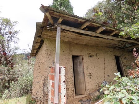 Un ejemplo de lo anterior, tal y como se aprecia en la figura 3, se manifiesta en las casas antiguas que aún sobreviven. De manera paradójica, aunque la vereda se encuentra cerca del perímetro de explotación de las minas a cielo abierto por medio de las cuales los chircales se abastecen de los materiales que utilizan para la fabricación de ladrillos y demás materiales de construcción derivados de la greda, las casas de los más antiguos habitantes de Pasquilla, venidos de una tradición campesina bien arraigada, construyeron sus casas utilizando técnicas arcaicas ya desaparecidas, como la tapia pisada y las paredes hechas a partir de bahareque y barro. Así nos lo cuenta don Eladio Chivatá, quien participó en la construcción de la casa antigua de sus padres: