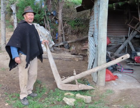 Como eso era todo el día hijuemadre tiren, y onde era tiesa la tierra… salía uno mamado [cansado]. […] aquí aquella vez yo estaba rompiendo [arando], hasta ahora estaba comenzando a conocer los bueyes, era mi taita el que tenía. Entoes me venía arando por todo este potrero. Y hasta por aquí alcancé. Mi papá había traído unos bueyes del centro, del matadero. Negros pero eran chiquitos. Y me faltaba este pedacito para romper y entonces me dijo: yo me voy para Bogotá, no vaya a coger los bueyes porque había un buey quera como bravo, tiraba duro. Y no vaya a coger los bueyes porque va y lo trompea. Yo no le dije nada, que se fuera, ya como les había puesto pasto, los agarré, los cogí como a las diez de la mañana y acabé esto. Cuando llegó me dijo que si me había dado mañas de enyugarlos. Mansitos, no me hicieron ni mierda. Yo como los manejaba. Tendría casi unos veinte años ya, pero entoes siempre les daba miedo que fueran y lo trompiaran [golpearan con la trompa] a uno, era que a veces uno tría bueyes de Zipaquirá y salían bravos, le tiraban a uno2.