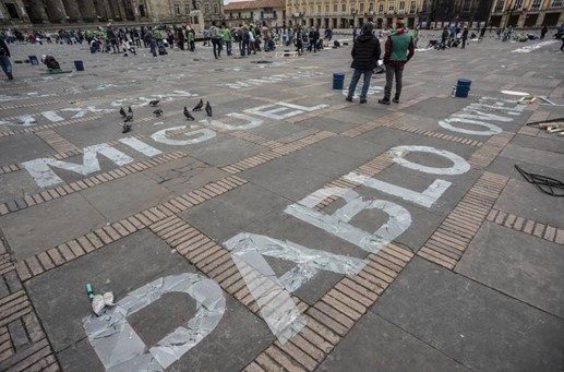 El 10 de junio de 2019 Doris Salcedo llevó a cabo en la plaza de Bolívar de Bogotá su propuesta artística Quebrantos, la cual aparece como una acción colectiva; sus materiales son vidrios, moldes metálicos y de madera con nombres de líderes y lideresas desaparecidos en Colombia durante el conflicto. El vidrio aparece como una metáfora de la fragilidad de la vida y de lo imposible que es reconstruirla una vez que esta ha sido rota. La acción requiere de la participación de otros actores diferentes a la artista, ya que Quebrantossolo funciona cuando los vidrios, que han sido recortados conforme a los moldes de los nombres y puestos sobre estos, son pisados por alguien y quebrados. Se trata entonces de una obra que involucra a sus espectadores y cuya experiencia está lejos de ser una mera experiencia estética de contemplación, sino que, al mejor estilo de la hermenéutica, se trata de una experiencia estética de transformación3.