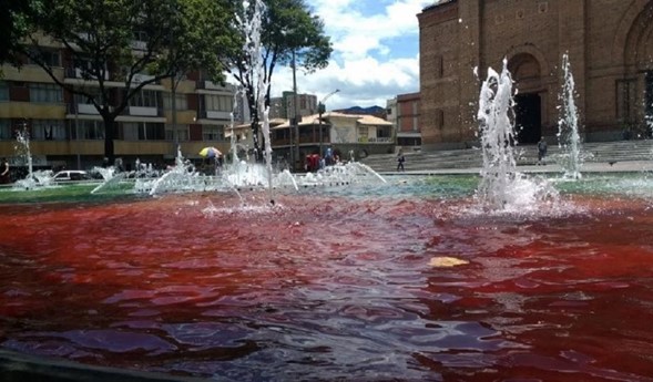 Hay otras obras que buscan llegar a públicos más amplios y sentar bases para la construcción de un dolor no solo individual, sino colectivo. Ejemplo de ello son las obras #NoMataras (figura 5), de un grupo de ciudadanos que tiñeron de rojo fuentes en Medellín (Antioquia) para dar un mensaje en contra de la violencia (KienyKe, 2017), o el performance “Un país que siembra cuerpos”, en el que cuatro artistas se colgaron de telas rojas en un puente en la misma ciudad con el fin de expresar el mismo rechazo a la violencia (Noticias Uno Colombia, 2019). Estas creaciones interpelan de forma directa a públicos en las calles de Medellín. No obstante, la literalidad que busca exponer crudamente la violencia, paradójicamente la banaliza y profundiza la memoria herida. Por una parte, se refuerza irreflexivamente la idea de que Colombia es un país violento e irracional, mientras que, por otro lado, lo que busca ser un choque de realidad para los espectadores se convierte en una exhibición de excentricidad que no contribuye a la construcción colectiva del trauma. Finalmente, la falta de lexicalización también limita el paso de la memoria herida a la memoria ejemplar.