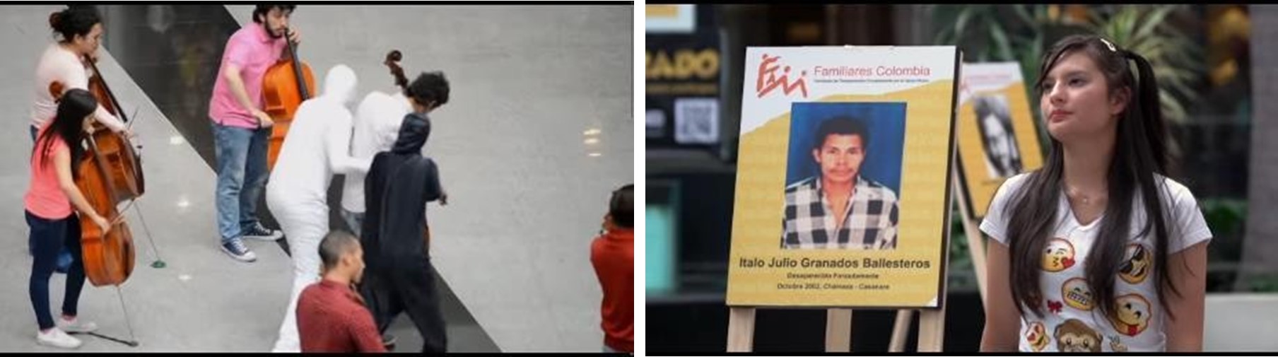 En este desplazamiento por el contínuum hacia el horizonte B se encuentran obras como Vivificar (figura 6), de Constanza Ramírez (2015). Se trata de un performance realizado en el 2015, en un centro comercial de Bogotá. Allí, mientras la orquesta sinfónica interpretaba el himno nacional colombiano, unos personajes sacaron del escenario a los músicos de uno a uno. La ausencia progresiva de los músicos afectaba la melodía del himno, hasta el punto de quedar en silencio. Cuando no quedaba ningún músico, familiares de desaparecidos entraron portando fotos de sus seres ausentes, y fue desplegada una valla con cifras y la frase “La desaparición de una sola persona afecta todo el conjunto de la sociedad” (Otras Voces, 2015). La forma en que este performance interpela al público deja un mensaje explícito y claro respecto al mensaje que se quiere comunicar: cualquiera puede ser víctima de desaparición y es necesario que nos solidaricemos con quienes lo han sido. De esta forma, la memoria transformadora se suma a la memoria herida y se pasa a una reflexión y dolor compartido, base de solidaridad. La lexicalización es clave para que el público reciba un mensaje sin ambigüedades.