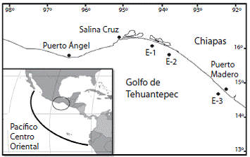 La zona de estudio (Figura 1), se encuentra ubicada den tro del Golfo de Tehuantepec (GT), presenta una platafor ma continental amplia y de fondos blandos fuertemente influenciada por la corriente de Costa Rica (CCR) con una productividad superficial elevada debido a las surgencias y a las descargas de agua dulce provenientes de las lagunas costeras del estado de Chiapas (Wilkinson et al., 2009) durante el invierno corren vientos intensos con velocidades >10ms-1 y duración de dos a seis días conocidos como "tehuanos', la interacción entre la CCR y los tehuanos produce un ascenso en la termoclina que se mezcla con el agua superficial actuando como deto nador del ciclo de nutrientes y del fitoplancton, el resto del año actúa como un mar tropical se reduce la biomasa fitoplanctónica y como resultado presenta baja produc tividad primaria (Wilkinson et al., 2009).