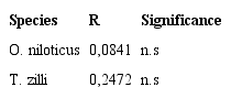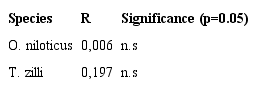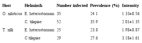 Table 1 shows the prevalence and intensity of parasites as recovered in the hosts. The highest prevalence (35,9) was obtained in O. niloticus that was found to be infested with Clinostomum tilapiae, while the highest mean intensity (3,18) was recorded in T. zilli infested also with Clinostomum tilapiae.